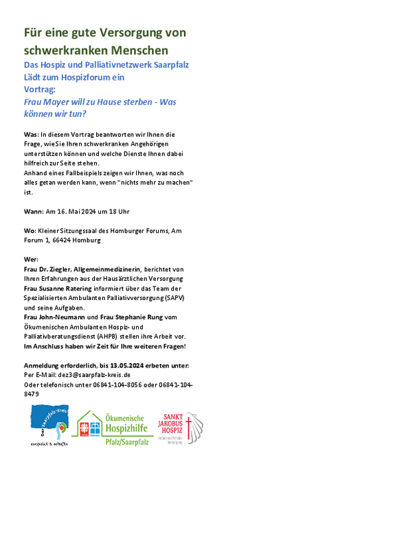 Was: In diesem Vortrag beantworten wir Ihnen die Frage, wie Sie Ihren schwerkranken Angehörigen unterstützen können und welche Dienste Ihnen dabei hilfreich zur Seite stehen.