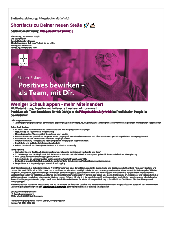 | Bitte bewerbe Dich über unser Jobportal bis zum 20.12.2025 und beziehe Dich dabei auf die Referenznummer 9645 der ausgeschriebenen Stelle. Mit dem Absenden der Bewerbung erklärst Du Dich mit den Datenschutzbestimmungen der Stiftung kreuznacher diakonie einverstanden. |