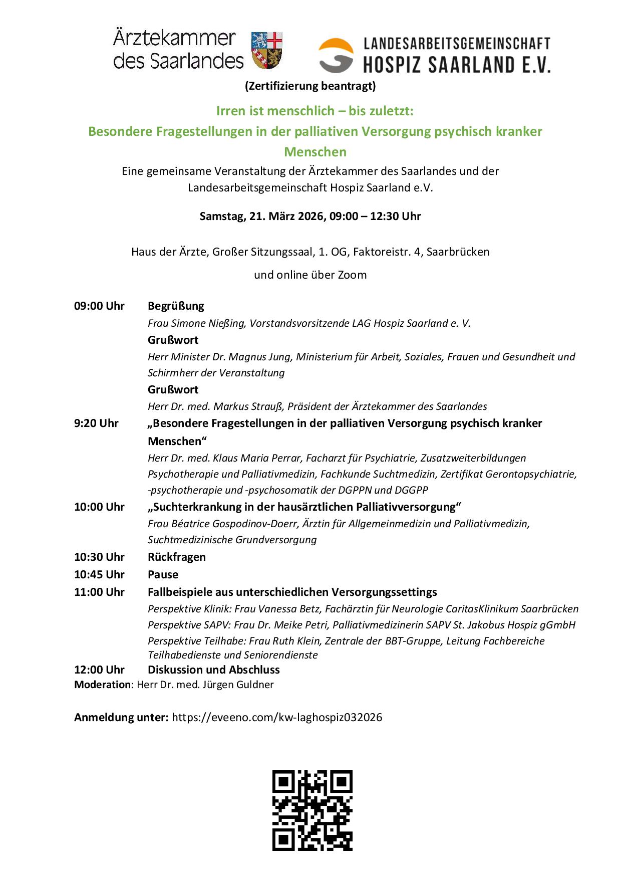 Eine gemeinsame Veranstaltung der Ärztekammer des Saarlandes und der Landesarbeitsgemeinschaft Hospiz Saarland e.V.