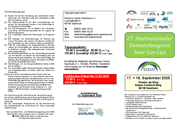 Die erfolgreiche Kongressreihe, die im Jahr 1997 begonnen wurde, wird am 17./18.09.2025 in Saarlouis zeitnah zum Weltalzheimertag (21.09.) fortgesetzt.